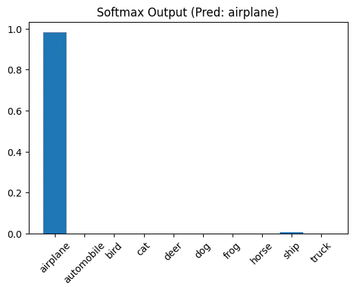 Progress | - Developed a lightweight CNN [Conv2D×2 + MaxPool]×3 → GAP → Dense(10) for CIFAR-10 Image Classification (32x32RGB) using both IEEE 754 floating-point and Q1.31 , Q1.15 , Q1.7 , and Q1.3 fixed-point arithmetic, achieving 84% accuracy in both implementations (Py ~85% | FP ~84% | Q31 ~84% | Q15 ~84% | Q7 ~82% | Q3 ~65%) |